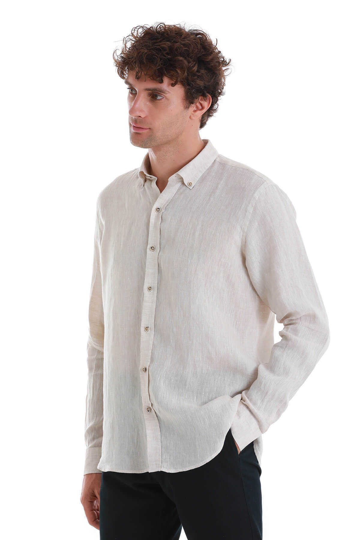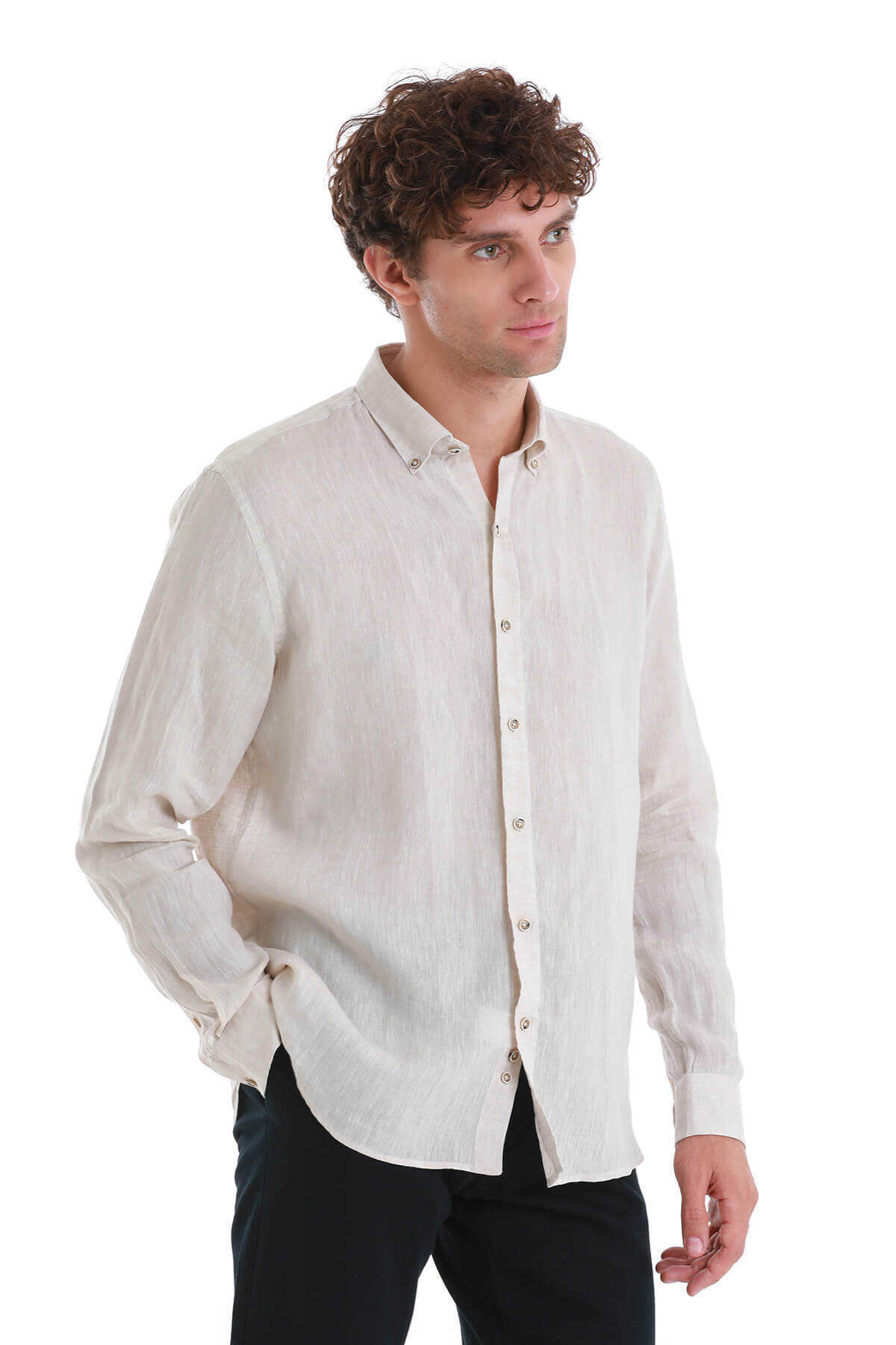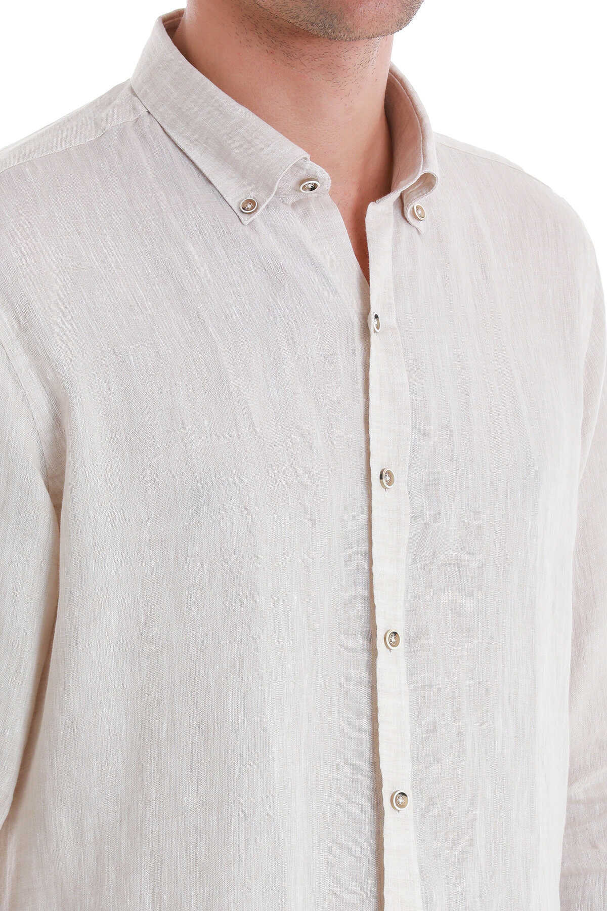 Bej Comfort Fit Düğmeli Yaka Uzun Kollu Keten Gömlek