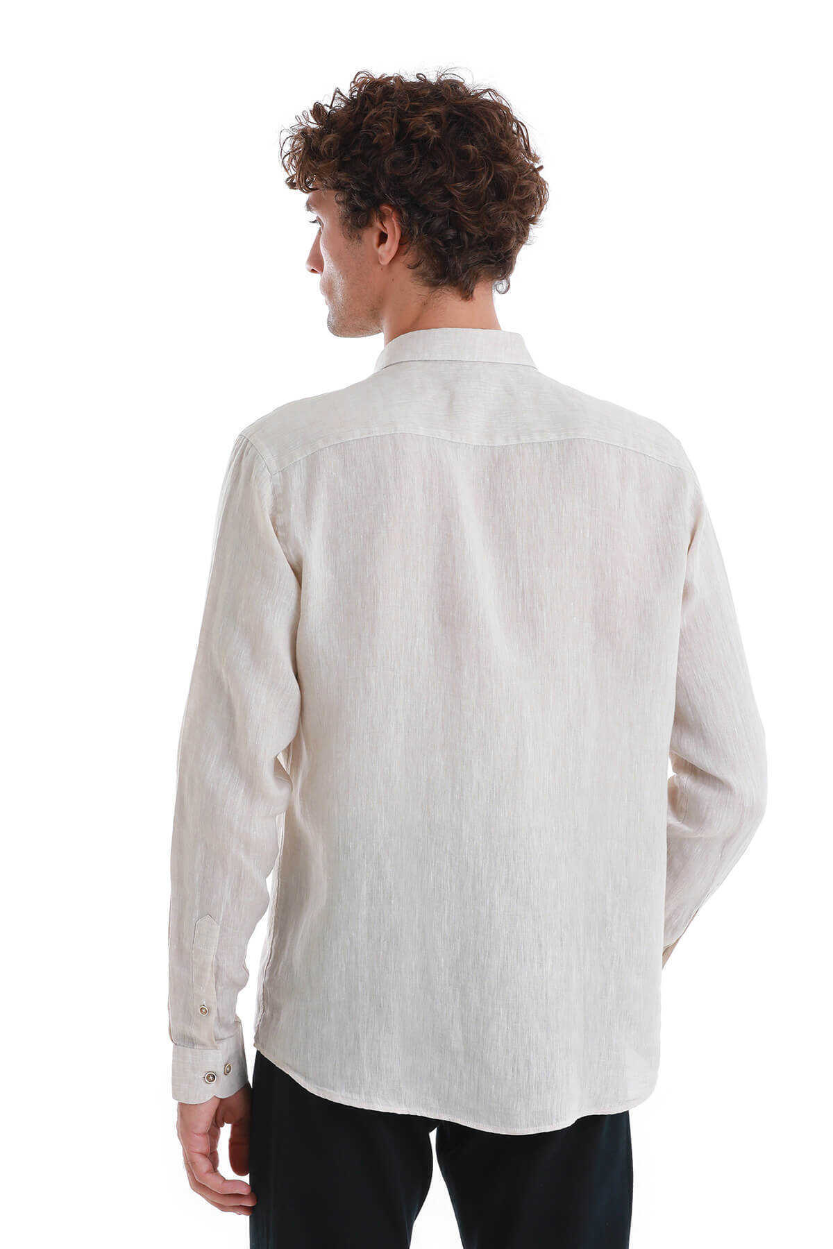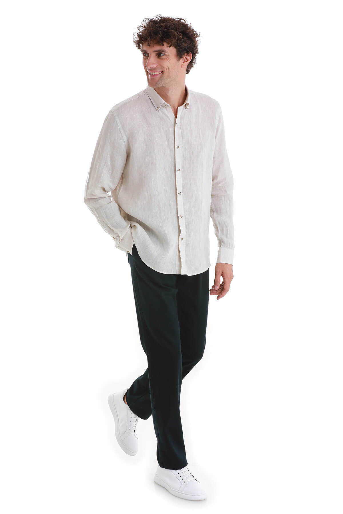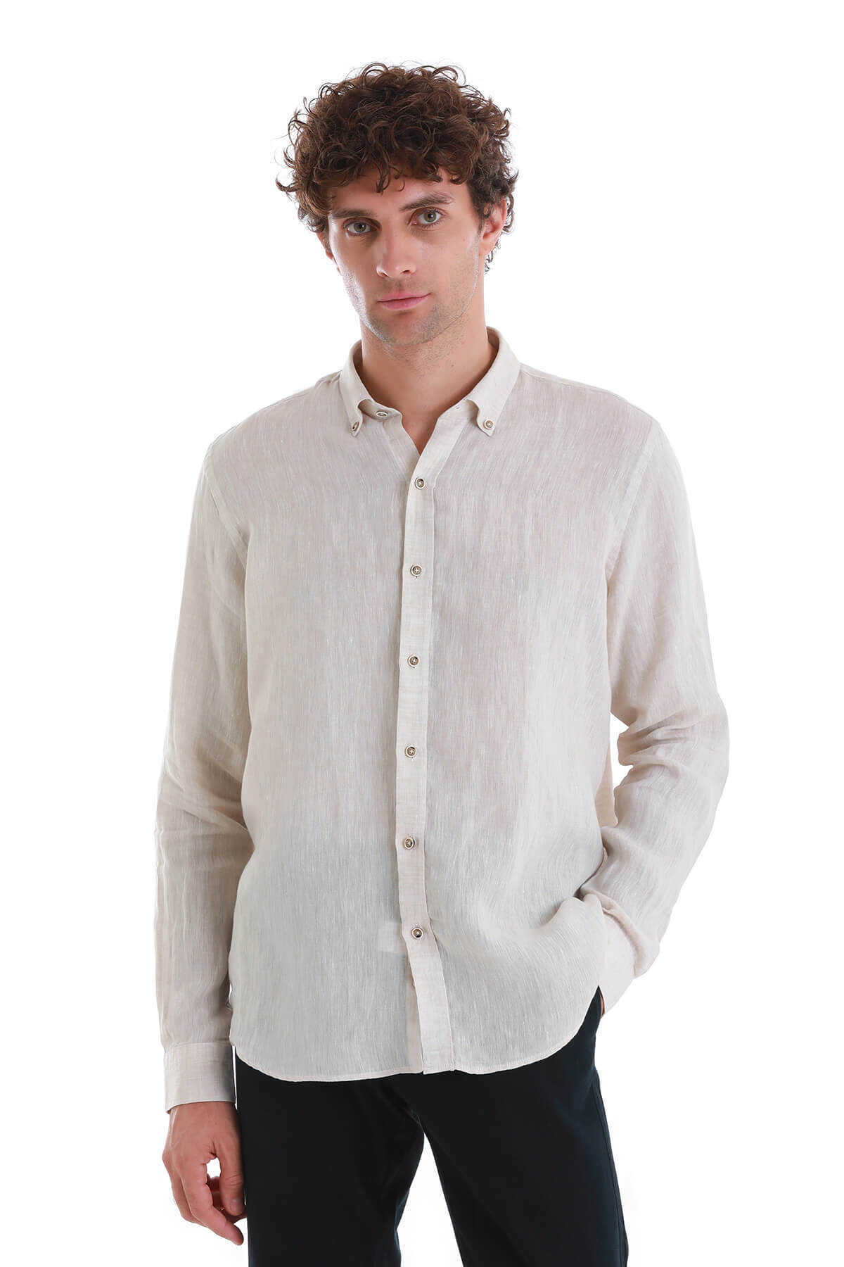 Bej Comfort Fit Düğmeli Yaka Uzun Kollu Keten Gömlek