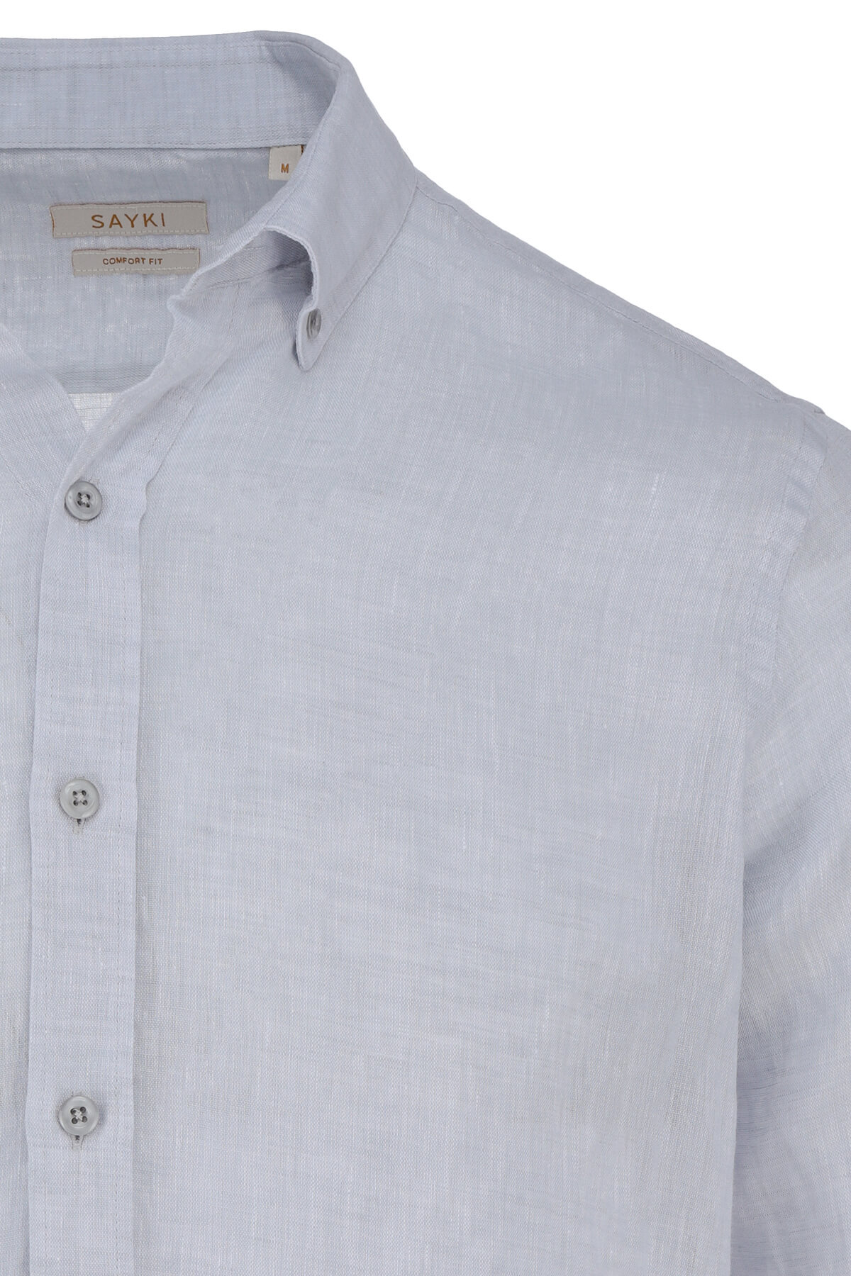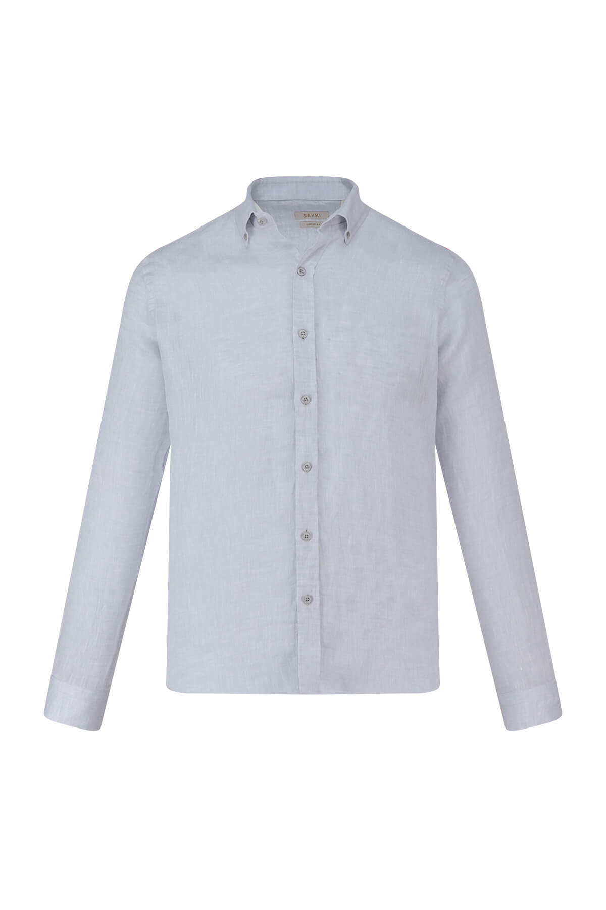 Gri Comfort Fit 100% Keten Düğmeli Yaka Uzun Kollu Keten Gömlek
