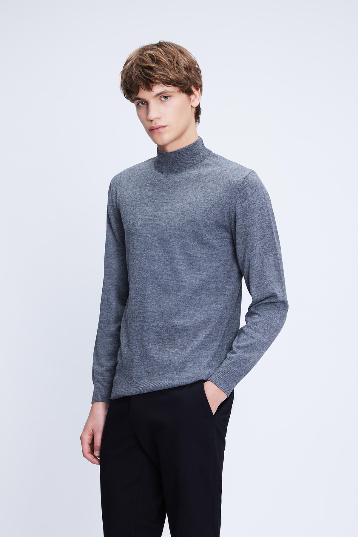 Gri Regular Fit Düz Yarım Balıkçı Yaka Yünlü Triko Kazak