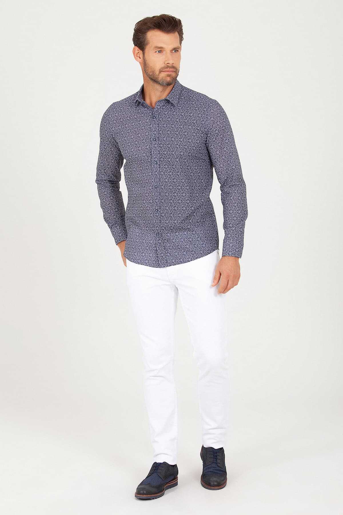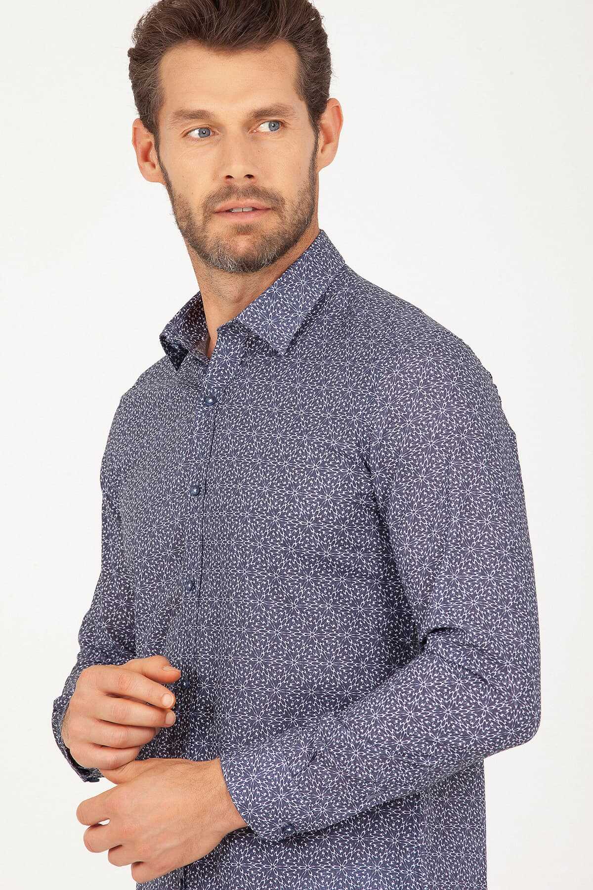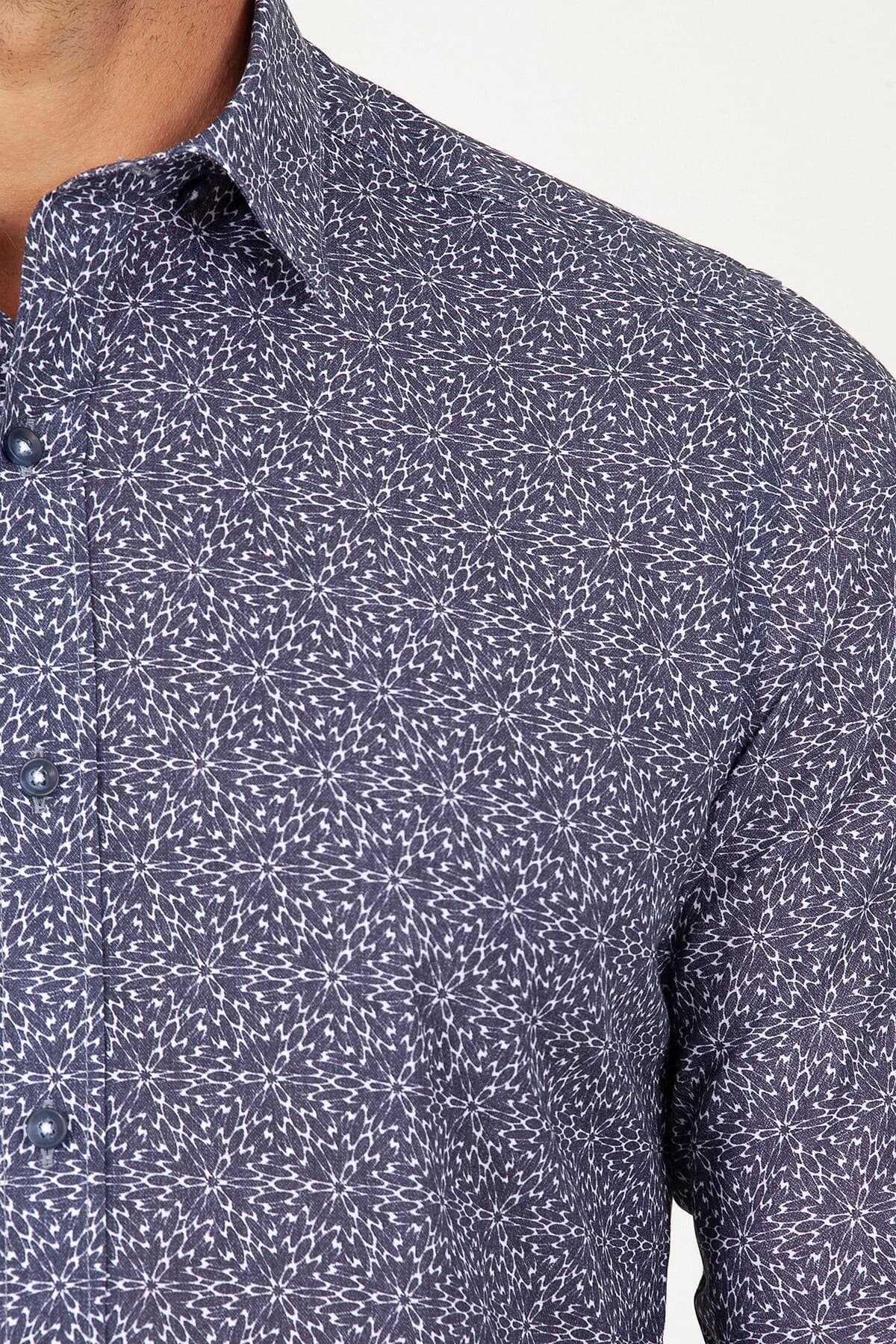 Lacivert Slim Fit Baskılı 100% Pamuk Uzun Kol Spor Gömlek