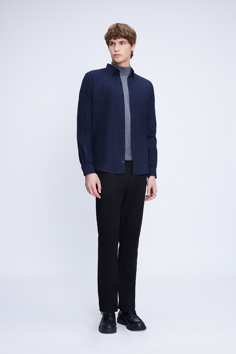 Lacivert Slim Fit Uzun Kol Düğmeli Yaka Flanel Gömlek