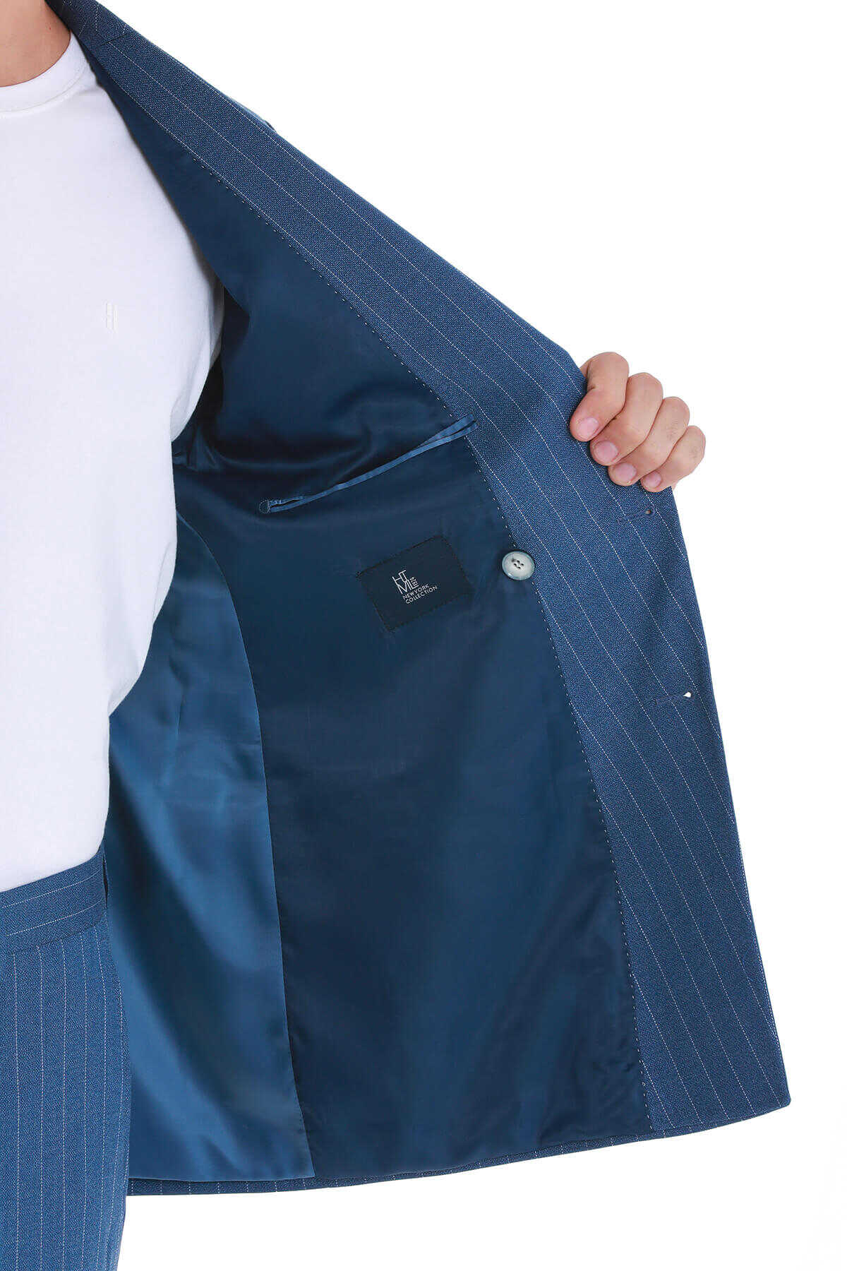 Mavi Slim Fit Çizgili Kruvaze Takım Elbise - 8