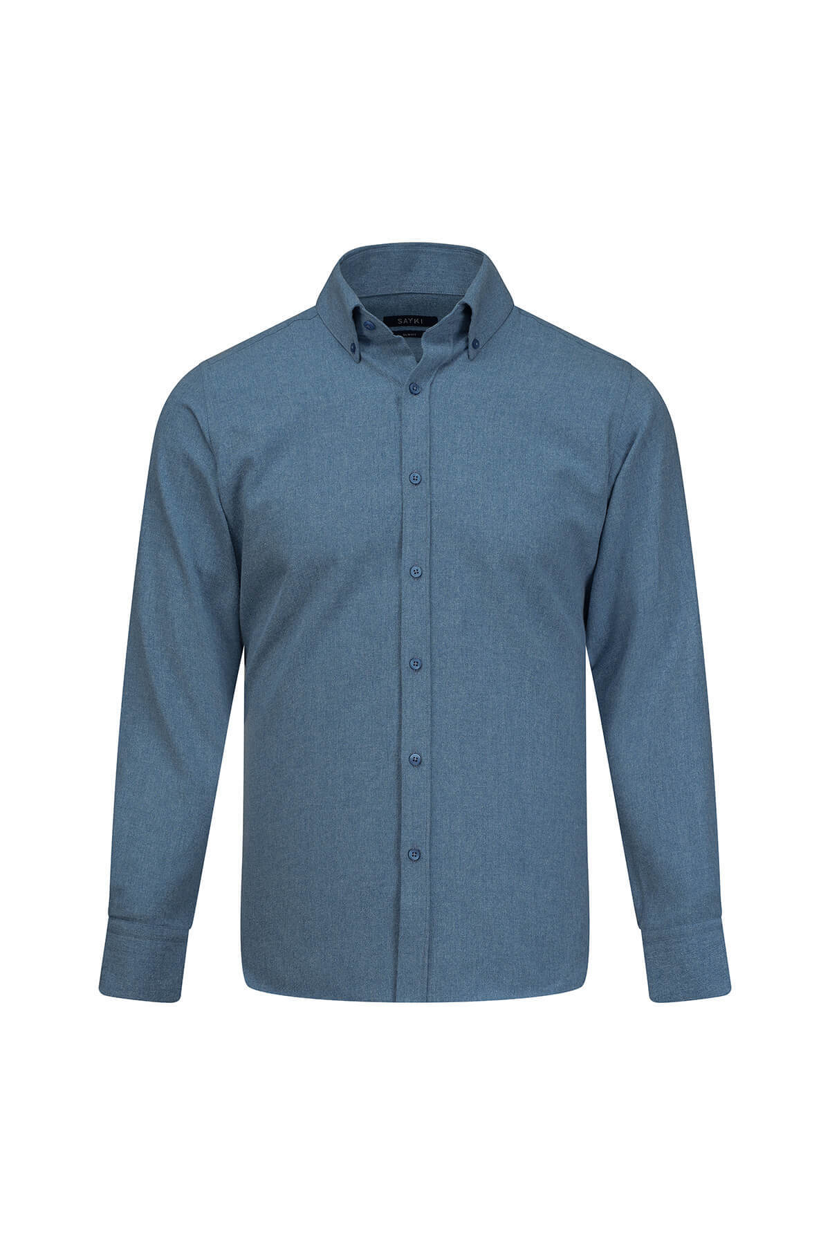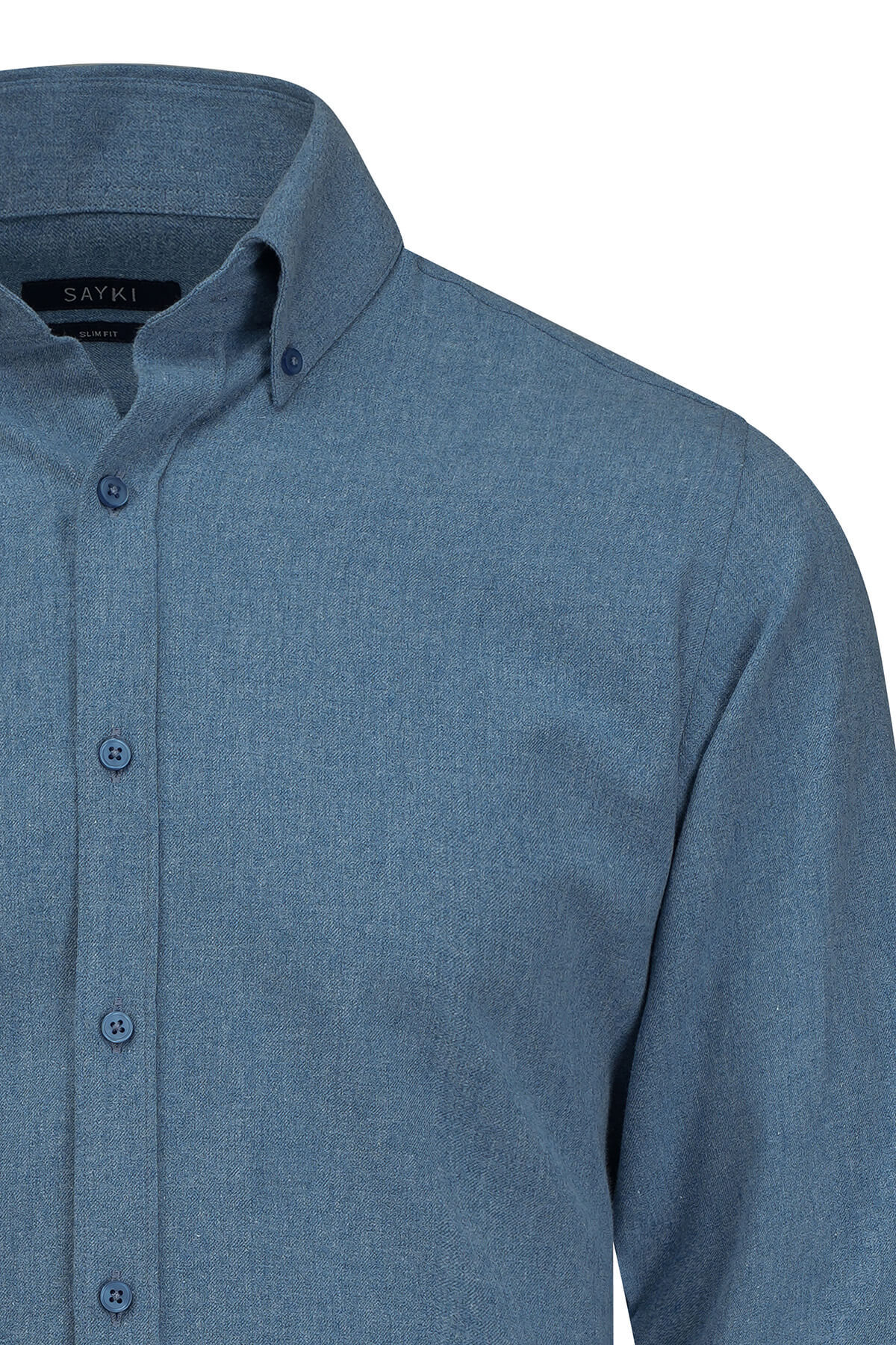 Mavi Slim Fit Düğmeli Yaka Pamuklu Uzun Kollu Spor Gömlek
